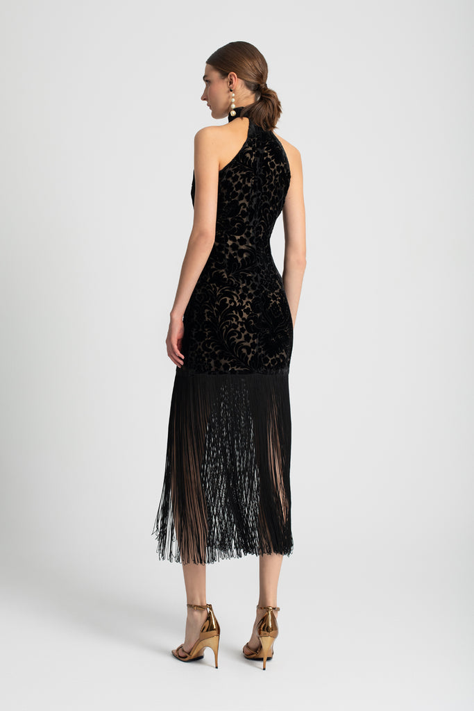 Εφαρμοστό βελουτέ φόρεμα σε μακρύ μήκος. Διαθέτει ανοιχτούς ώμους, ψηλό λαιμό και κλείσιμο με φερμουάρ και κουμπιά στο πίσω μέρος.
