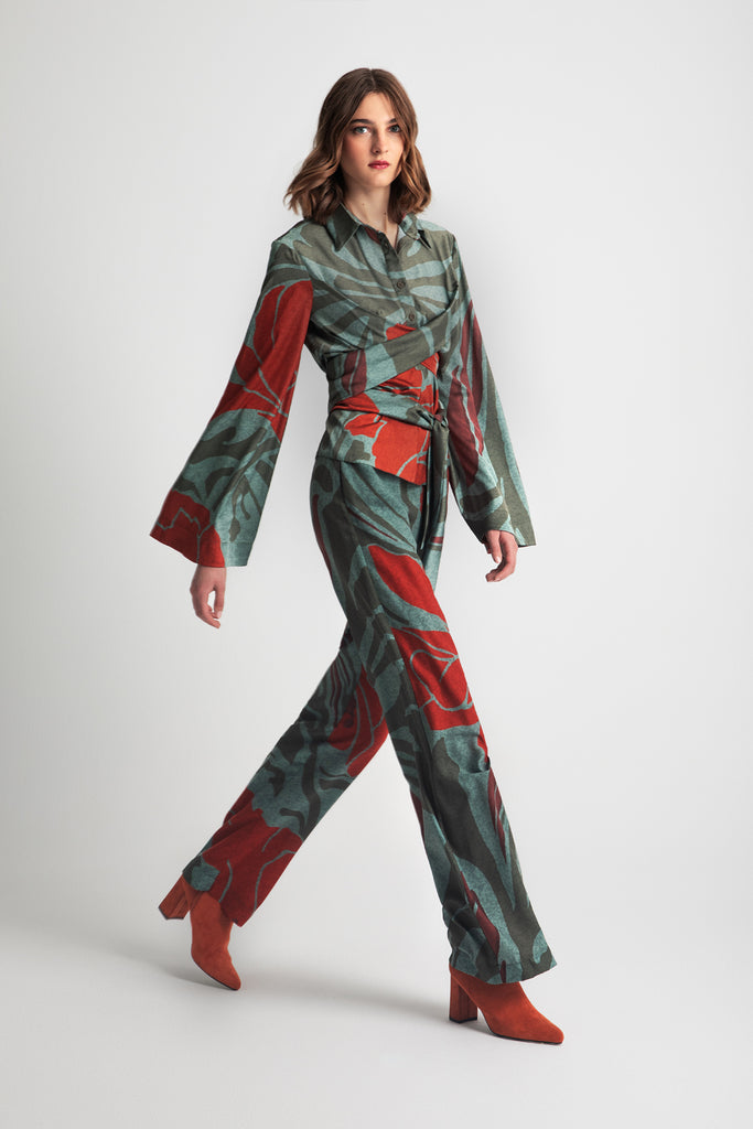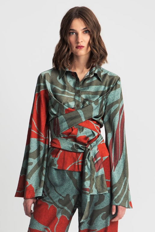 Πουκάμισο με εντυπωσιακό φλοράλ μοτίβο. Διαθέτει μακριά φαρδιά μανίκια, κλείσιμο με κουμπιά και ιδιαίτερο δέσιμο χιαστί.