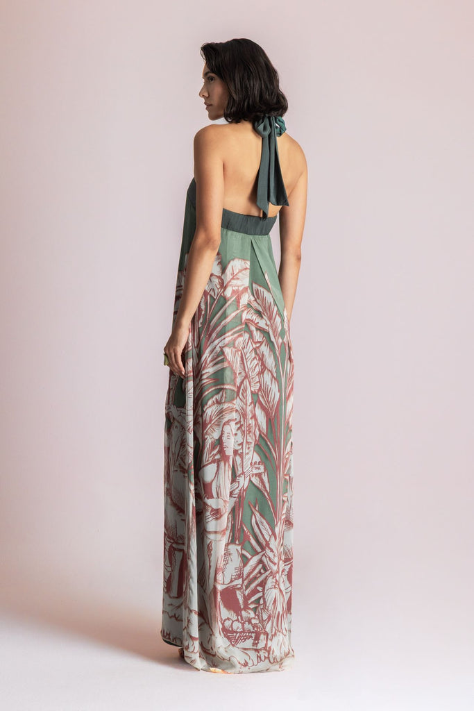 Εντυπωσιακό maxi φόρεμα σε γήινες αποχρώσεις. Διαθέτει ιδιαίτερο δέσιμο στον λαιμό με φαρδιές φάσες που χαρίζουν κίνηση καθώς φλοράλ σχέδιο. Το ύφασμα είναι ελαφρύ και χυτό ιδανικό.