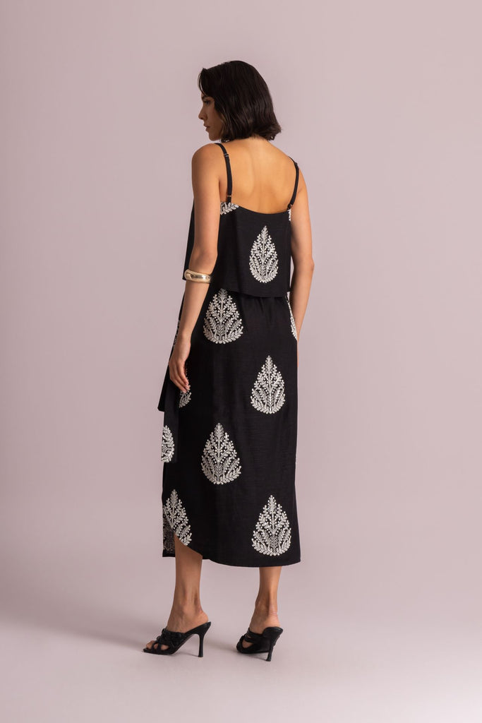 Αμάνικο Τοπ σε κλασικό μαύρο χρώμα, ξεχωρίζει για το περίτεχνο λευκό κέντημα στο κέντρο και στο τελείωμα. Διαθέτει λεπτές τιράντες, ανάλαφρη υφή και άνετη γραμμή.