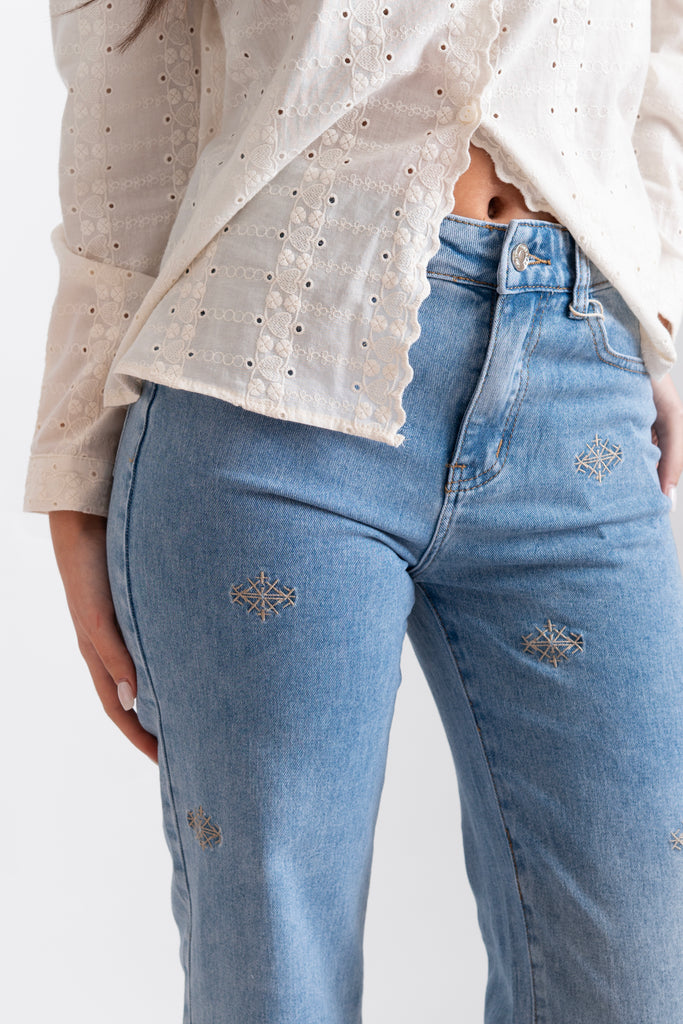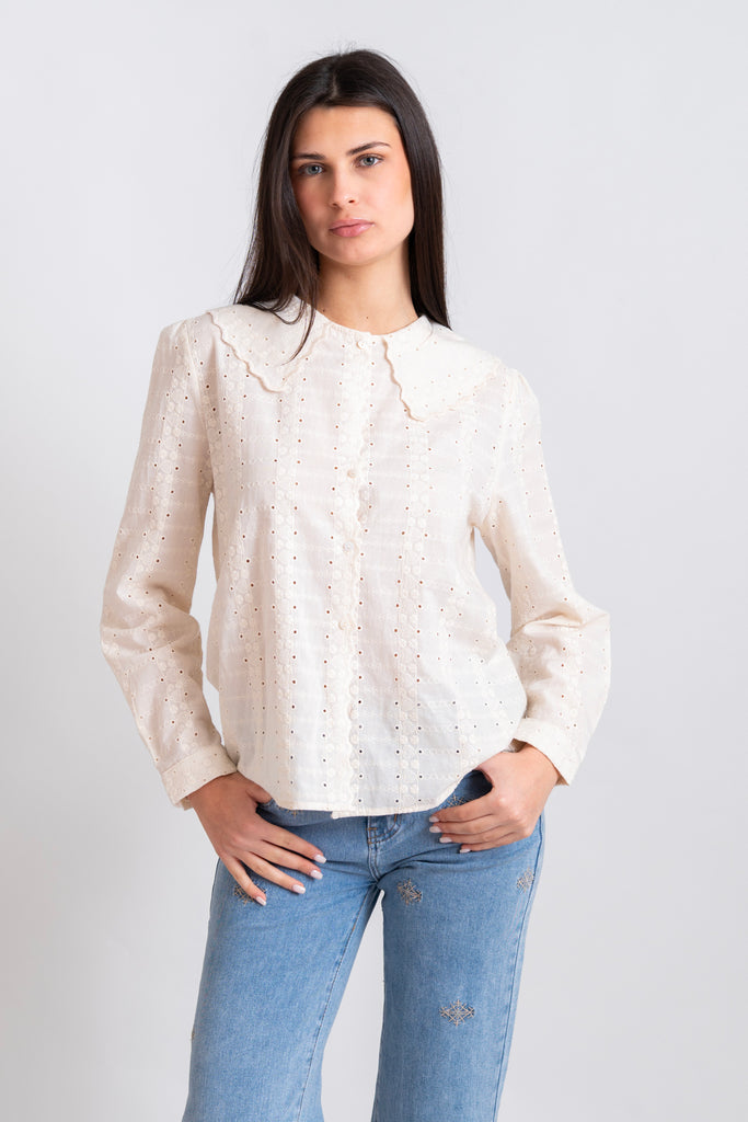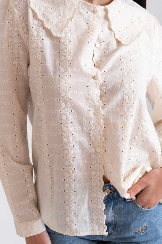Εκρού Ρομαντικό Πουκάμισο με κεντητό γιακά και ανάγλυφο floral σχέδιο. Έχει ελαφρύ και δροσερό ύφασμα. Διαθέτει διακριτικά κουμπιά.