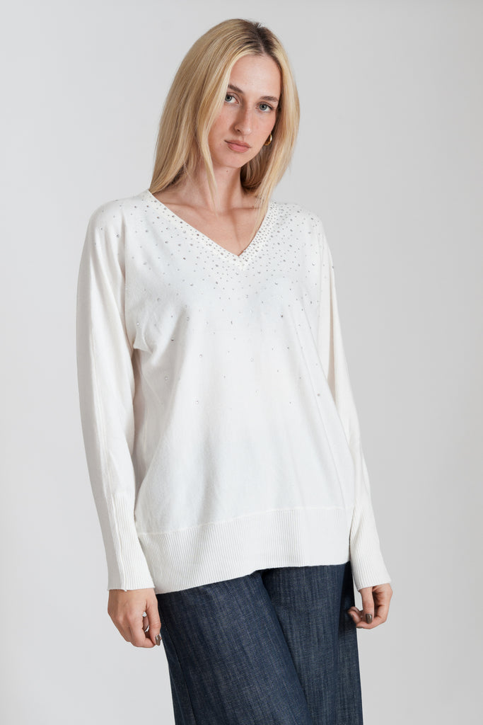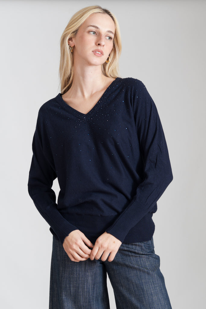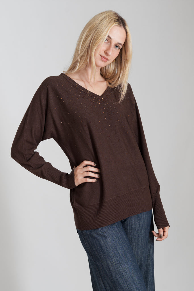 Μπλούζα με μαλακή υφή, V λαιμόκοψη, άνετη εφαρμογή, διακοσμημένη με στρας μπροστά και σχέδιο rib στο τελείωμα του μανικιού και της μπλούζας.