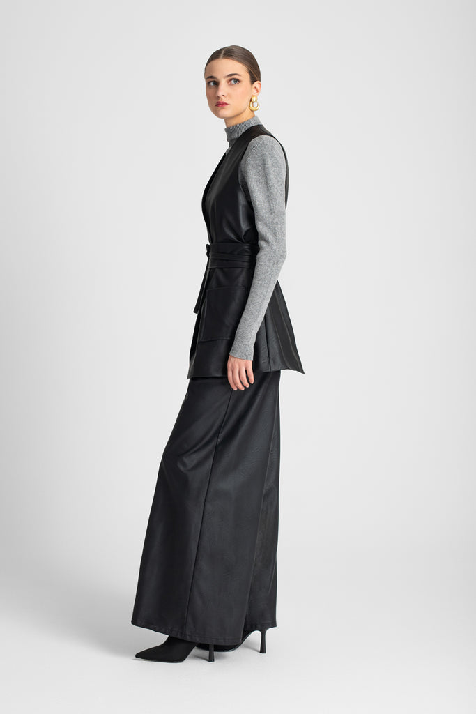 Faux leather γιλέκο με comfort εφαρμογή. Διαθέτει V λαιμόκοψη, κλείσιμο με ένα κουμπί, αποσπώμενη ζώνη καθώς και δύο πλαϊνές τσέπες.