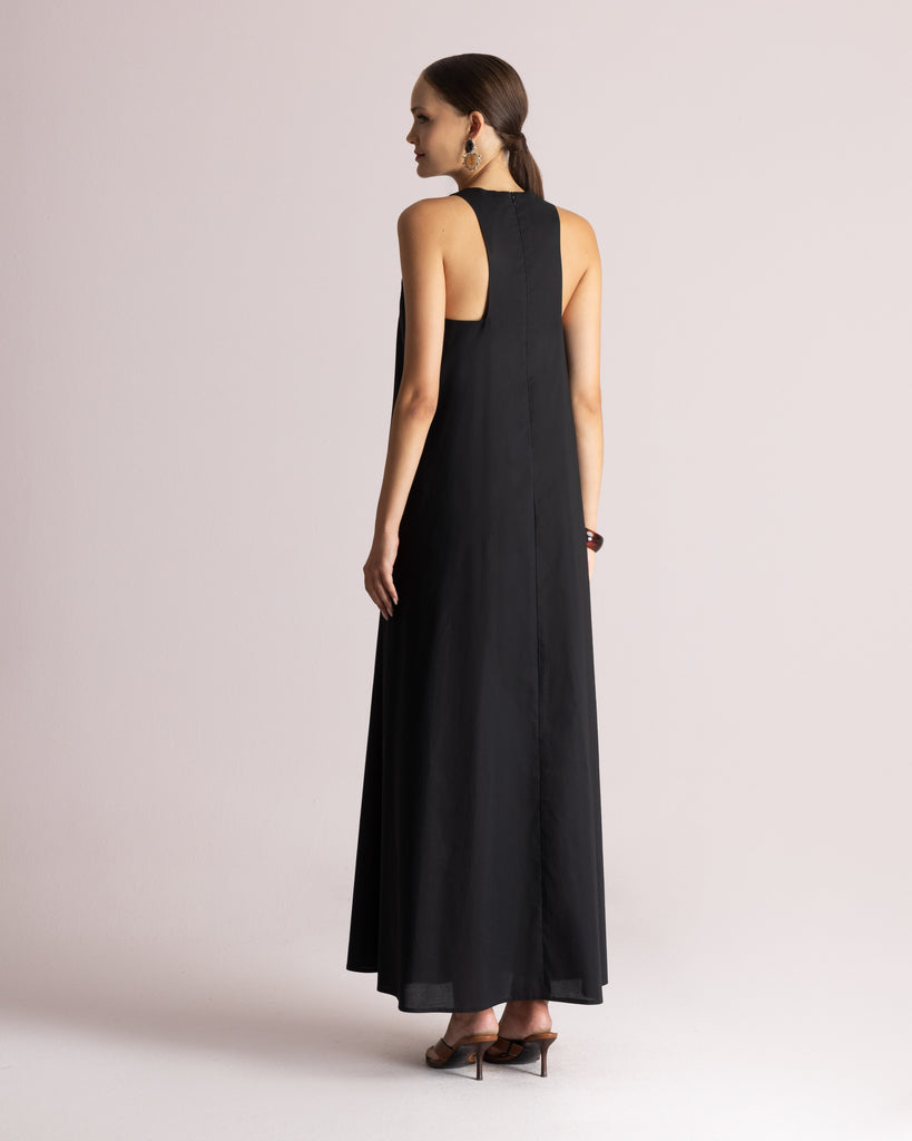 Μακρύ φόρεμα σε A-line γραμμή με κομψό V-neck μπροστά και τετράγωνο κόψιμο στο πίσω μέρος . Διαθέτει κρυφό φερμουάρ στην πλάτη για τέλεια εφαρμογή , καθαρές ραφές που ενισχύουν το minimal ύφος του και  αποσπώμενη ζώνη προσφέροντας την δυνατότητα να τονίσετε την μέση.
