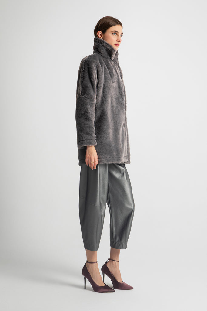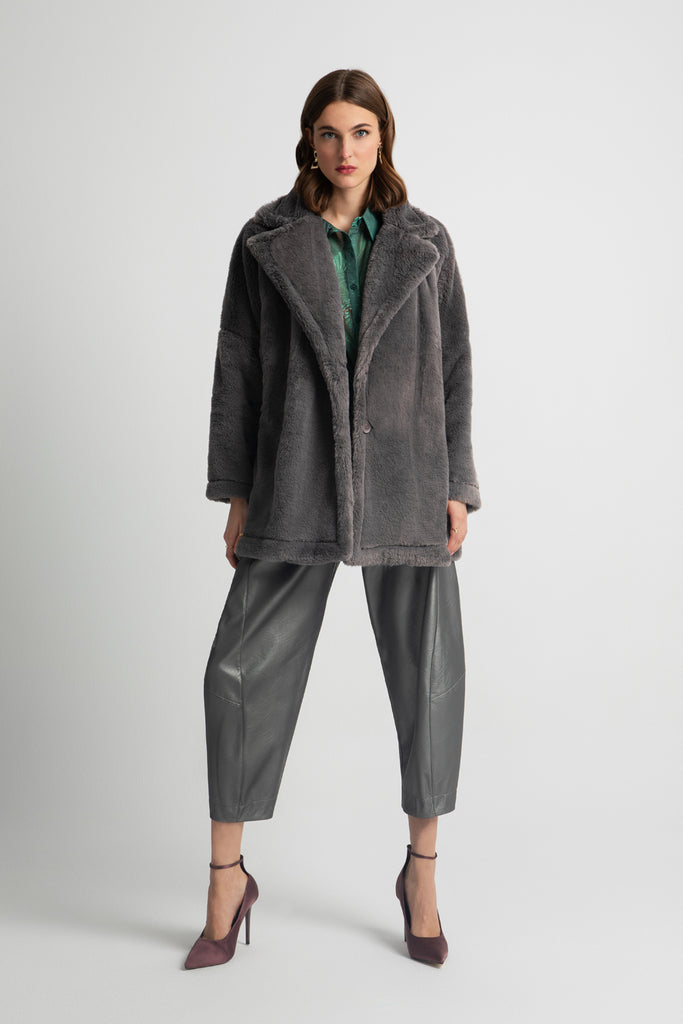 Γούνα συνθετική σε midi μήκος και τσέπες στο πλάι. Διαθέτει κλείσιμο με κουμπιά και ελαφρώς oversize εφαρμογή.