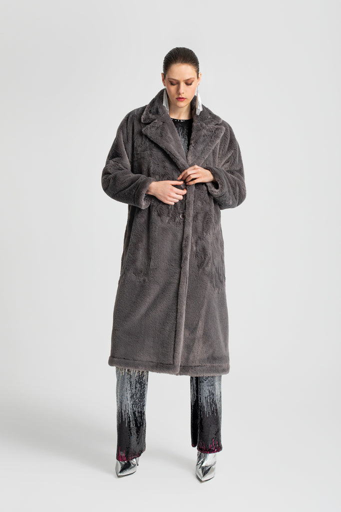 Γούνα συνθετική σε μακρύ μήκος και τσέπες στο πλάι. Διαθέτει κλείσιμο με κουμπιά και ελαφρώς oversize εφαρμογή.