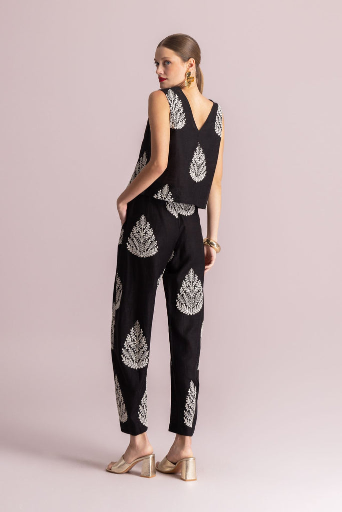 Αμάνικο Τοπ σε κλασικό μαύρο χρώμα, ξεχωρίζει για το περίτεχνο λευκό κέντημα στο κέντρο και στο τελείωμα. Διαθέτει τιράντες, ανάλαφρη υφή , άνετη γραμμή και διακριτικό άνοιγμα στην πλάτη.