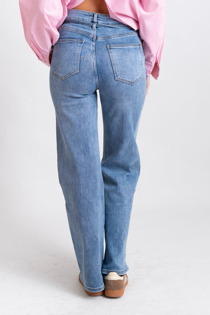 Τζιν ψηλόμεσο σε medium blue απόχρωση , που ξεχωρίζει για το ιδιαίτερο δέσιμο denim με κορδόνι στην μέση. Έχει άνετη ίσια γραμμή που κολακεύει τη σιλουέτα.