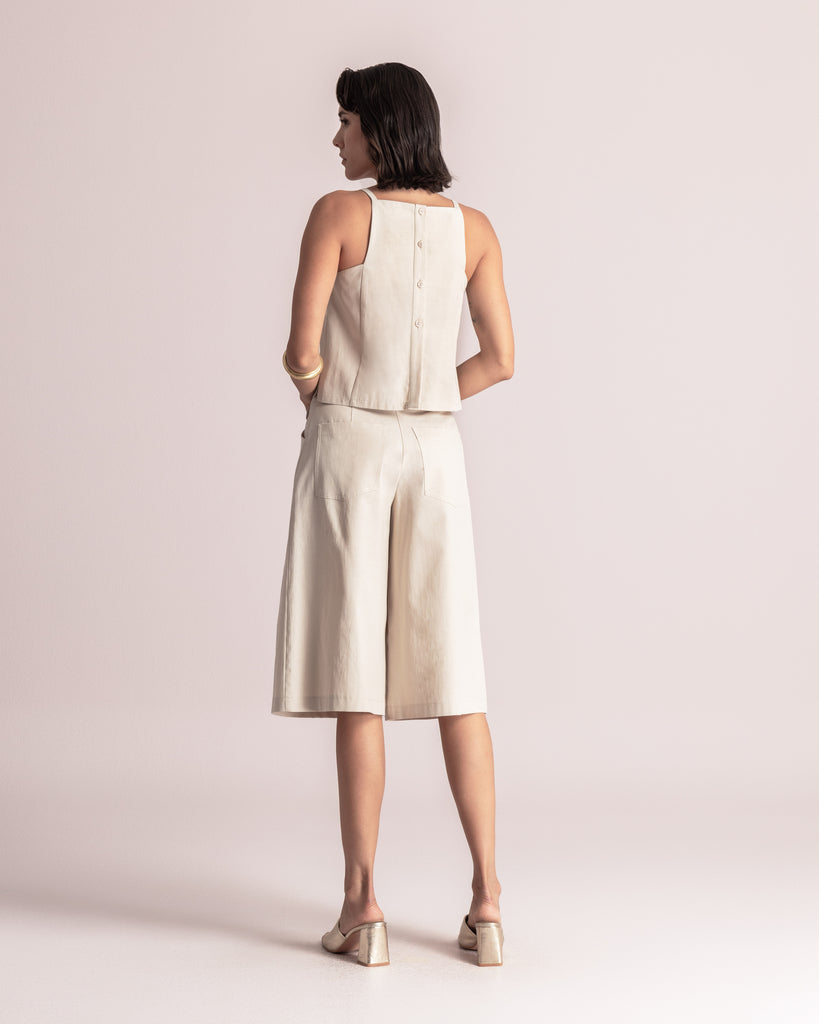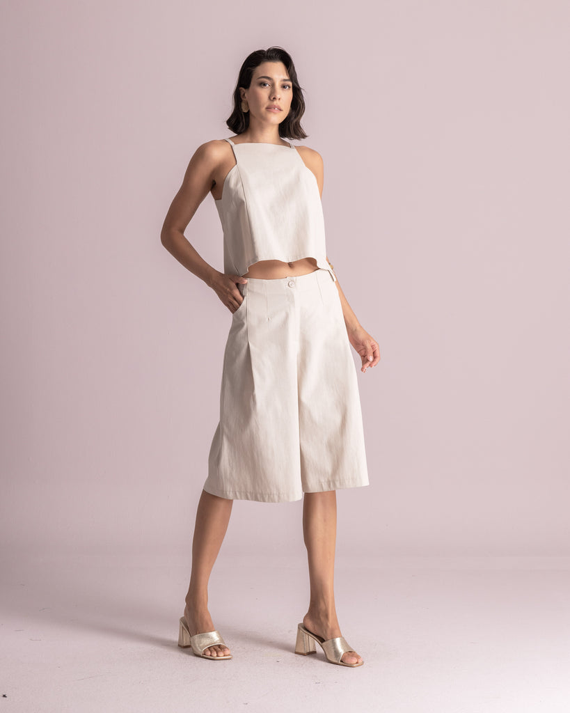 Βερμούδα σε φαρδιά γραμμή με κομψές πιέτες. Διαθέτει διακριτικές πλάγιες τσέπες και θηλιές για ζώνη.